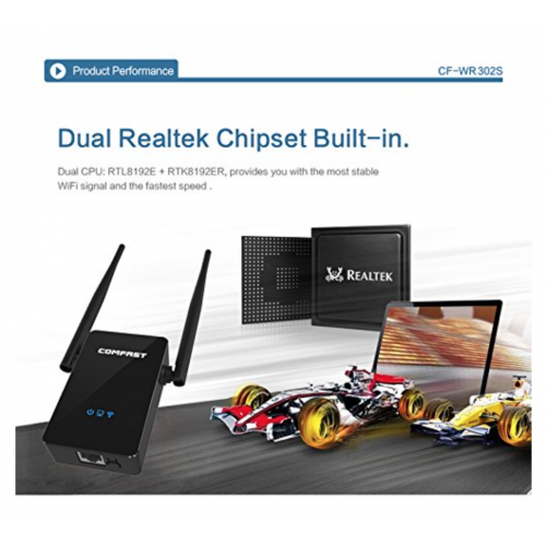 COMFAST CF-WR302S is a WiFi repeater which can be used for WiFi signal extension or boosting ,It works alongside your router to enhance transfer rates and to extend the range of your Wi-Fi network ,the transport speed can reach up to 300Mbps,built-in Dual realtek chipset,360︒ WiFi covering ,it also has dual external 5dBi Antenna, which is very strong and can go through walls and extend WiFi coverage to long distance. By the way it's also a environmentally friendly design,it's stable with low radiation and low power,it's not just a WiFi repeater ,it can also work as an AP which turns wired network to wireless, and can act as a mini router which can be used for home, so it's no reason for you to miss it!