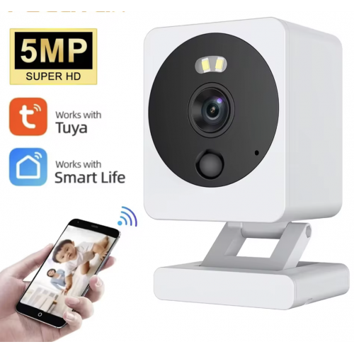 Smart 5MP outdoor camera for efficient surveillance. Equipped with 'Tuya' app, offers 2K resolution, color night vision and PIR motion detection for maximum safety